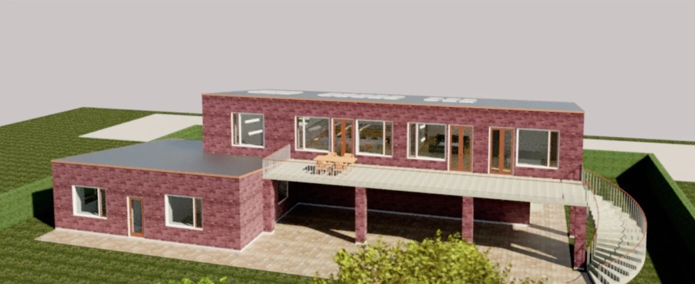 Brixval har selv leget med tanken om et moderne funkishus, der indeholder de samme stilkvaliteter som den oprindelige funktionalisme, men som bedre rummer det moderne liv. Huset er stort og tegnet med frie tøjler for at udforske ideen om et moderne funkishus. Der er nemlig mange elementer, der er værd at tage med sig, når man tegner nyt. I starten af 2020 tegnede han sit bud på et moderne funkishus. Huset er skabt til en udsigtsskøn placering. Du kan læse mere om projektet og se skitserne her. Et stort rundt vindue i hallen, en rundet trappe og symmetriske vinduer er blot få af de elementer, der er stærkt inspirerede af funktionalismen.